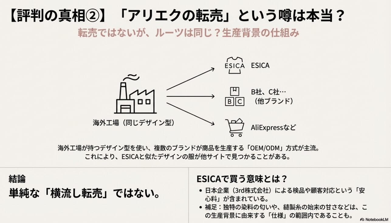 しかし、これは単に「アリエクの商品を買ってきて横流ししている」という単純な転売とは少し事情が異なります。多くのアパレルD2Cブランドは、中国や韓国の卸市場や工場と契約し、そこにある既存のデザイン型(パターン)を使って生産する「OEM」や「ODM」という方式を採用しています。