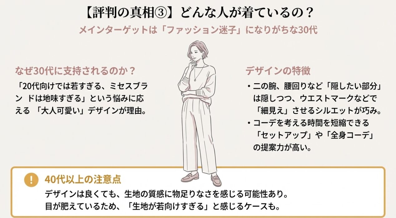なぜ30代に刺さっているのでしょうか。それは、ESICAのデザインが「20代のトレンド感」と「40代の体型カバー欲求」のちょうど中間を突いているからです。20代向けのファストファッションでは少し若作り感が出てしまうし、かといって百貨店のミセスブランドでは地味すぎてつまらない…という、ファッション迷子になりがちな30代にとって、ESICAの「大人可愛い」提案は非常に魅力的です。