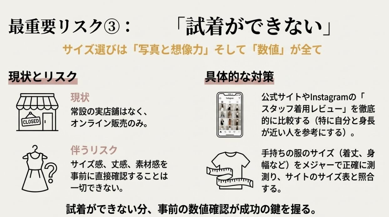 実店舗を持たないことで、家賃や人件費を抑え、その分トレンドのデザインをスピーディーに展開できるというメリットがある反面、消費者にとっては購入前に試着をしてサイズ感や素材感を確かめることが一切できないという大きなデメリットがあります。