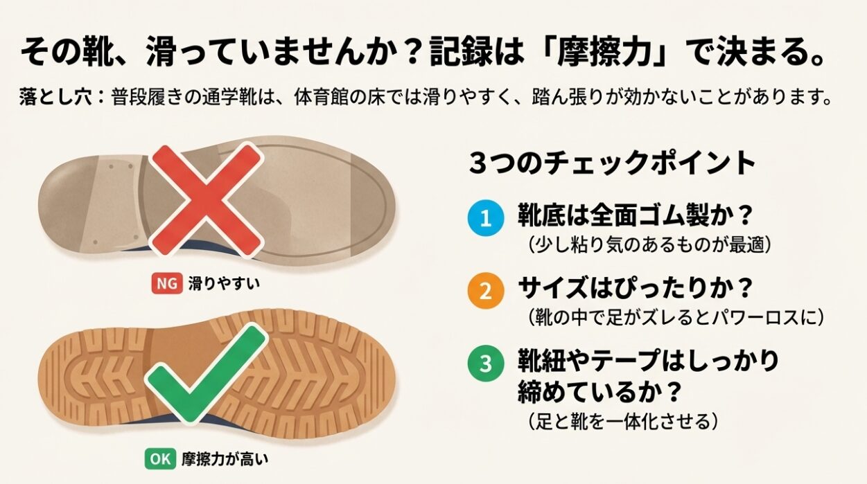「弘法筆を選ばず」という言葉がありますが、スポーツテスト、特に反復横跳びにおいてシューズの性能は記録を左右する決定的な物理要因です。どれほど素晴らしい筋力とテクニックを持っていても、ツルツル滑る靴では、その力を床に伝えることができません。摩擦力こそが正義なのです。