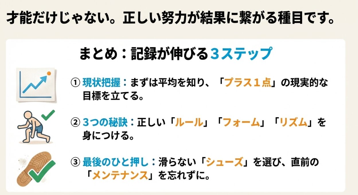 さらに、今日から家庭でも実践できる具体的な練習方法や、記録向上に直結するシューズ選びのポイントまで、専門的な視点を交えつつ、わかりやすくお伝えしていきます。