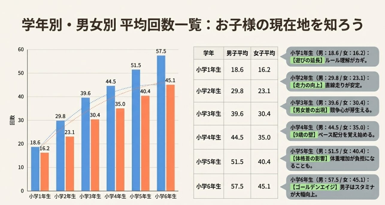 | 学年 | 男子平均(回) | 女子平均(回) | 発達段階とポイント |