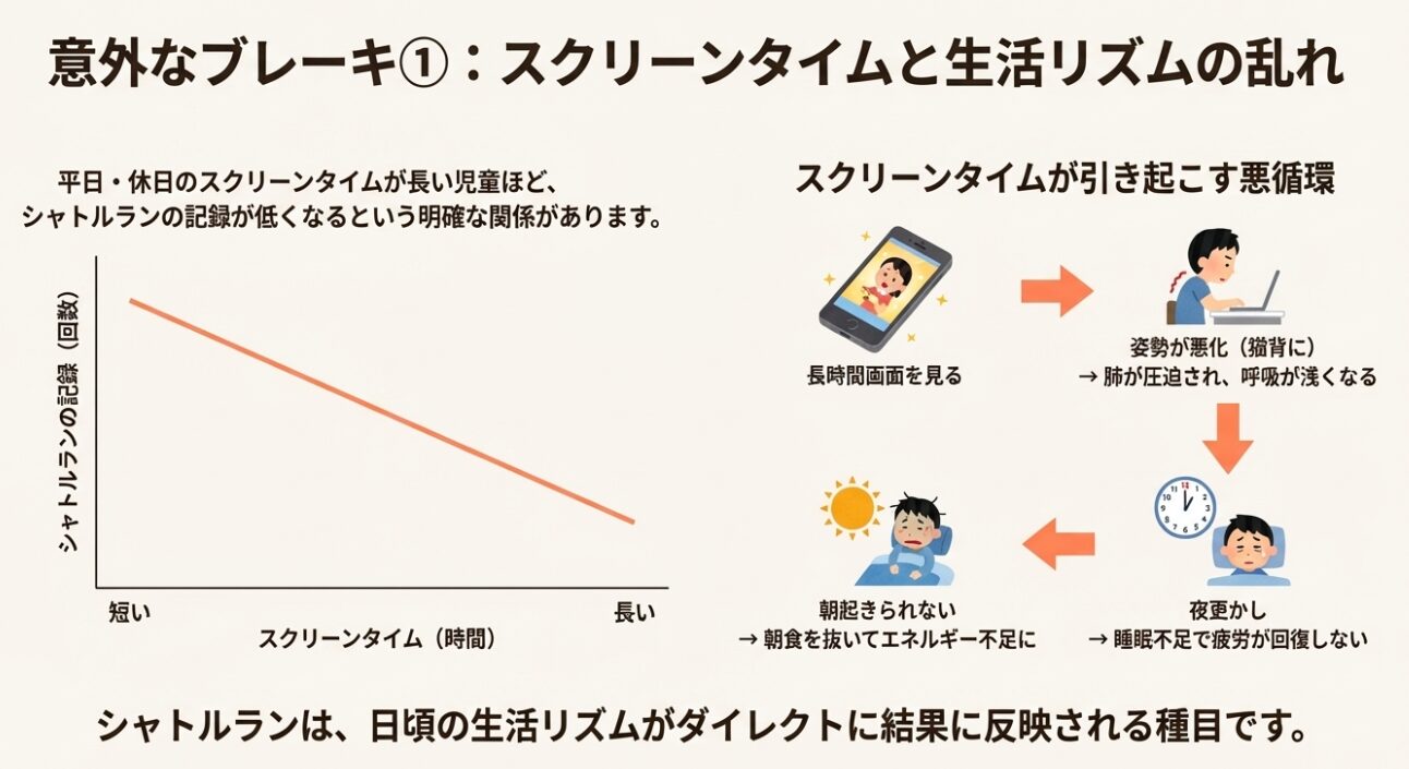 スポーツ庁の分析で、最も衝撃的だったのが「スクリーンタイム(テレビ、スマホ、ゲームなどの画面視聴時間)」と体力の関係です。データによると、平日および休日のスクリーンタイムが長い児童ほど、シャトルランの記録が低くなるという、きれいな反比例の関係が見つかりました。